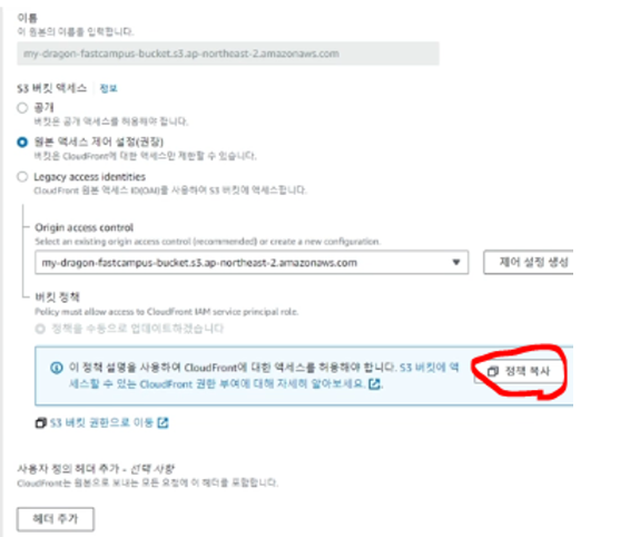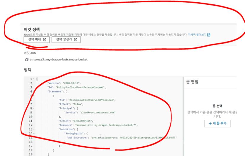 그 후 이 Cloudfront의 정책을 복사해서 S3 bucket에서 Policy를 그대로 박아주자.