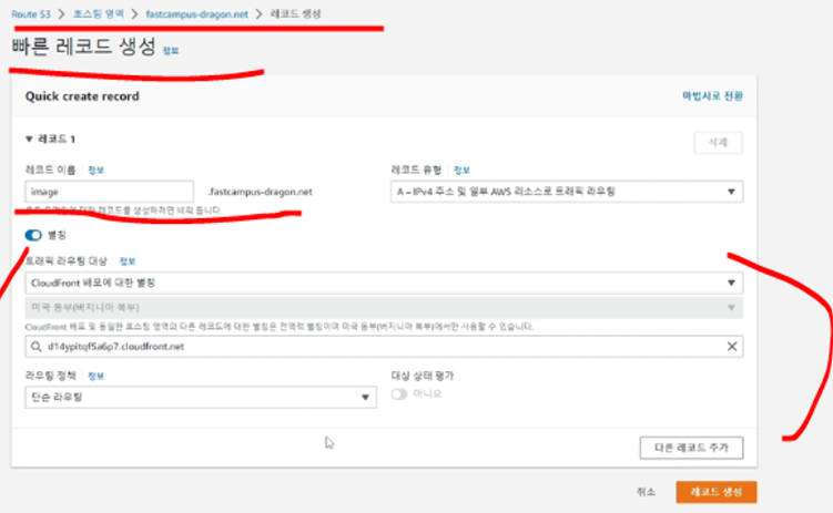 지금까지는 자동으로 생성된 Cloudfront 도메인으로 작업을 했지만(아래와 같이) 이제 레코드를 설정해서 내가 설정한 레코드로 도메인이 설정되도록 해주자