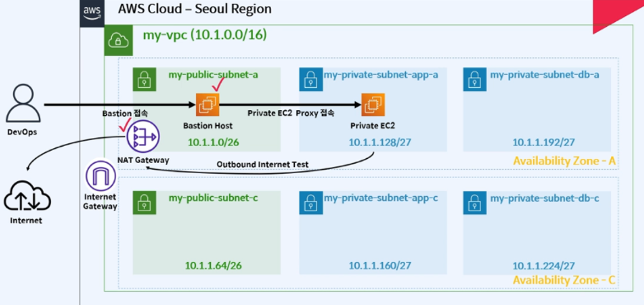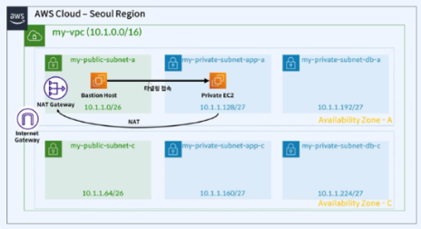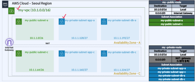 언제나 순서는 Region 선택 → VPC 생성(CIDR 대역 만들기) → Subnet 생성하면서 해당 Region의 AZ 선택으로 진행된다.