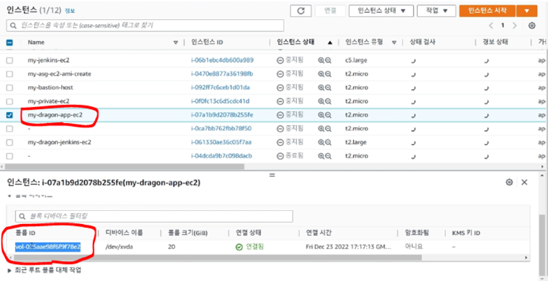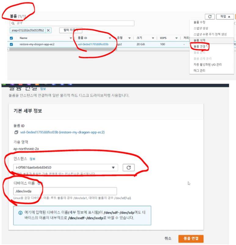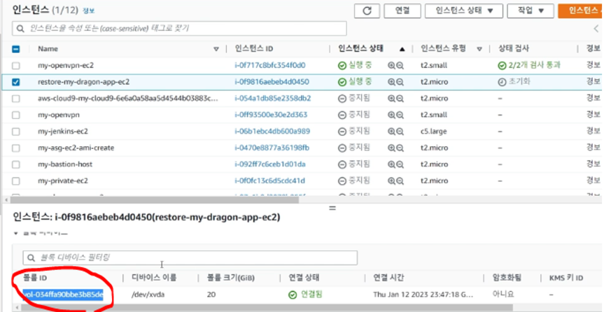 그 후 이 복원한 EBS Volume을 복원했던 EC2(restore-my-dragon-app-ec2)에 붙여보도록 해보자.