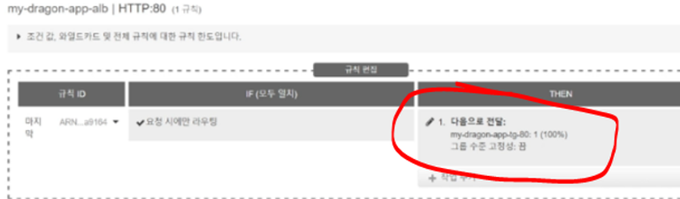 HTTP 80에서 HTTPS 443으로 redirect하던 설정을 아래와 같이 바로 my-dragon-app-tg-80으로 가도록 해주자 왜냐하면 ACM이 Cloudfront(ALB 앞에 위치)에 위치해있으므로 이미 ALB에 오기도 전에 HTTPS 인증이 끝나서 안전하게 걸러진 것들만 들어오기 때문에 HTTP 80으로 ALB에 꽂히는 애들은 그대로 Frontend(Nginx)로 보내줘도 된다.