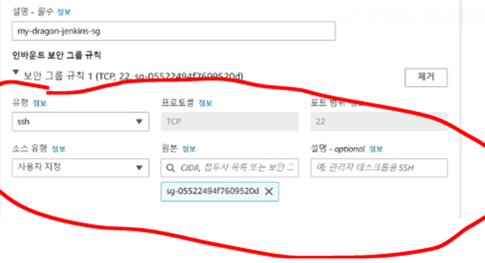 이후 jenkins의 sg가 22번 port로 my-dragon-app-ec2로 들어올 수 있도록 inbound policy에 아래를 추가해주자.