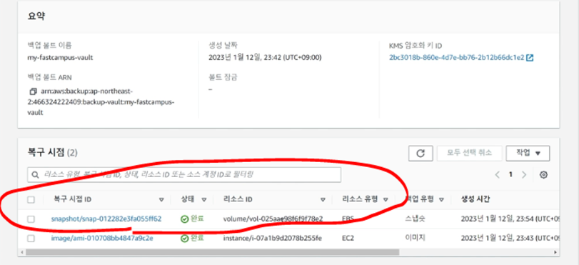 그러면 백업 볼트에 이 EBS Volume 백업본이 Snapshot으로 아래와 같이 생성되어 있다