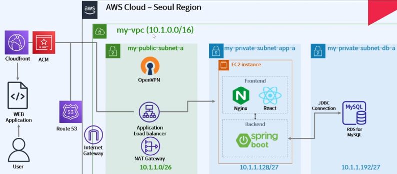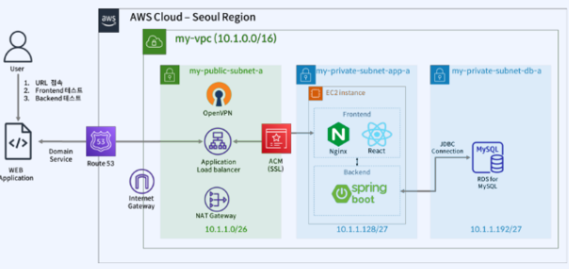 목표 아키텍쳐 = Public Sebnet에 있는 ALB에 ACM을 붙여서 HTTPS 인증이 가능하도록 만들어서 HTTPS로 통신이 가능하게 해주고, 라우트 53을 제일 앞단에 붙여서 도메인을 등록한 후 Domain 쿼리를 통해 Service로 연결이 되게끔 구성을 하자