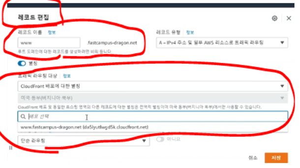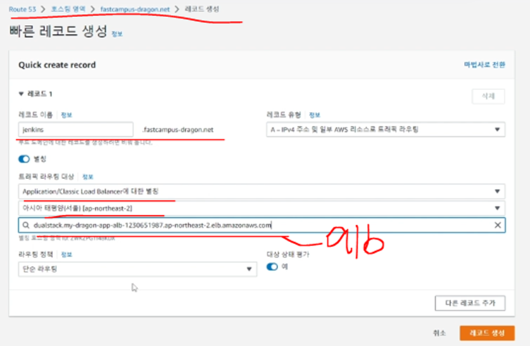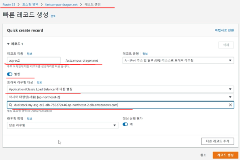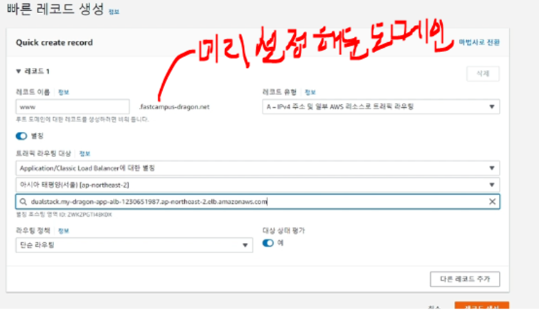 이후 이 ALB에 Route53을 설정해주기 위해 먼저 내가 생성해놨던 호스팅 영역인 fastcampus-dragon.net을 선택 후 이 안에 레코드를 아래와 같이 생성해주자.
