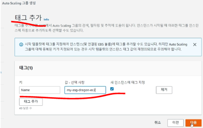 해당 ASG에서 만들 instance에 붙일 Name Tag까지 아래와 같이 붙여주자