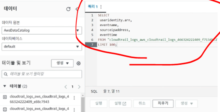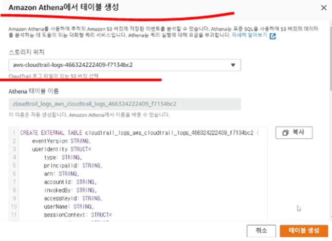 그 후 이 S3에 대해 Athena에서 테이블(AWS 공홈에 있는 CloudTrail Audit Athena table 예제 활용)을 생성하여 이 S3에 대해서 쿼리할 수 있게 해주자.
