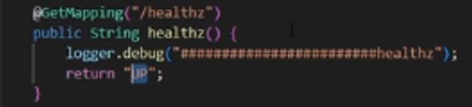 해당 SpringBoot Project의 application.properties에는 정상적으로 RDS를 connection하기 위해서 RDS의 endpoint(RDS가 생성될 때 부터 자동으로 생성되어 할당됨)가 spring.datasource.url로 들어가 있다. 그리고 이 Spring Boot Application의 Controller에는 /healthz로 up이라고 return하는 아래의 API도 들어가 있다.
