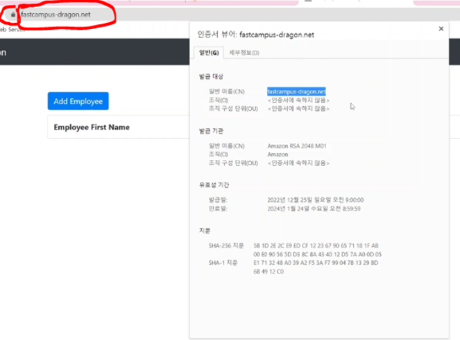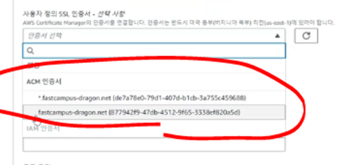 이후 ACM에 들어가서 퍼블릭 인증서(SSL 인증서)를 요청해주기 위해서 먼저 어떤 도메인에 발급할건지에 대해 fastcampus-dragon.net이라는 domain과 *.fastcampus-dragon.net이라는 domain에 퍼블릭 인증서(SSL 인증서)를 요청해준다.