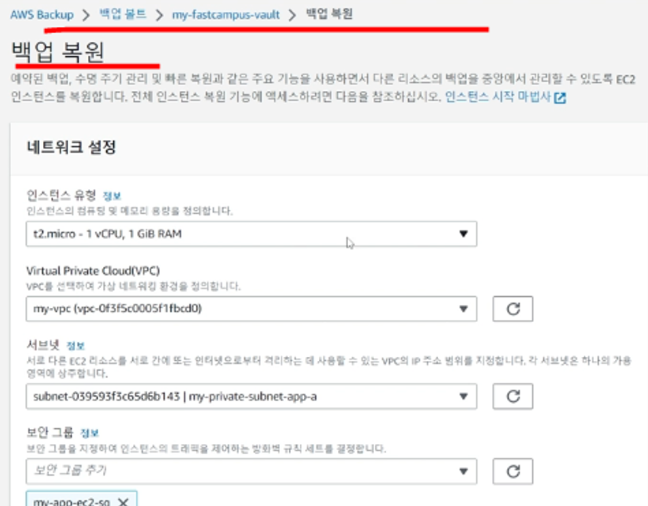 만약 내가 복원을 하고 싶다면 내가 만들어뒀던 백업 볼트에서 아래와 같이 복원을 누르면 이 AMI에 들어있던 기존 EC2의 정보대로 default setting이 되게 된다.