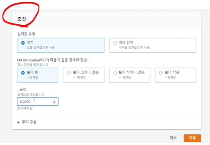 이제 이 CloudWatch에 Metric에 대한 Condition 기능을 아래와 같이 추가해보도록 하자.