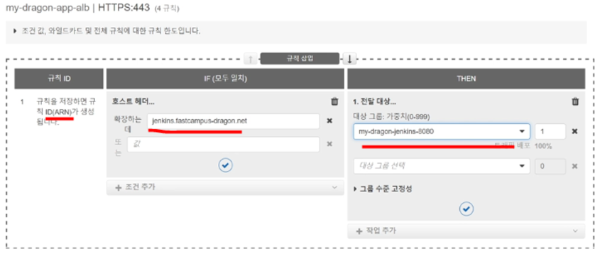 이후 아래와 같이 jenkins ec2를 tg로 만든 후 ALB(my-dragon-app-alb)에 규칙(health check는 /login으로 해주자)을 추가해서 HTTPS 443으로 들어올 경우 트래픽이 전달되도록 하자.