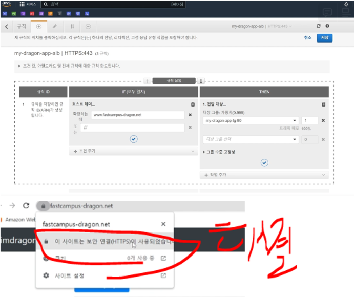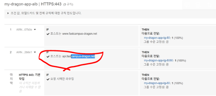 이후 이 ALB의 listner tab에서 HTTP:80 Listener를 THEN 부분에서 HTTPS 443으로 Redirection하도록 설정해두고, HTTPS:443 Listener는 IF 부분에 host header로 api.fastcampus-dragon.net으로 설정 후 THEN 부분에서 전달대상으로 my-dragon-app-tg-8080으로 전달이 되도록 해주고, 이 Listner의 기본 동작으로는 my-dragon-app-tg-80으로 전달되도록 해주자.