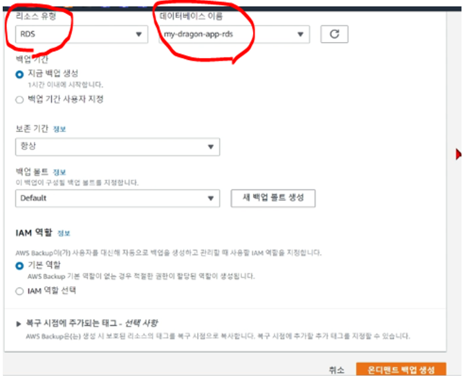기존에 사용하던 RDS를 백업하기 위해서 온디맨드 백업을 아래와 같이 생성해주면서 백업 볼트는 기존에 사용했던 vault를 선택해주자
