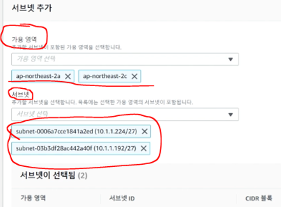 그 후 VPC로 내가 만들어둔 VPC를 설정하고 AZ과 subnet을 아래와 같이 내가 미리 만들어뒀던 mapping pair로 2개를 선택해두자(나중에 혹시 모를 이중화를 위해서)