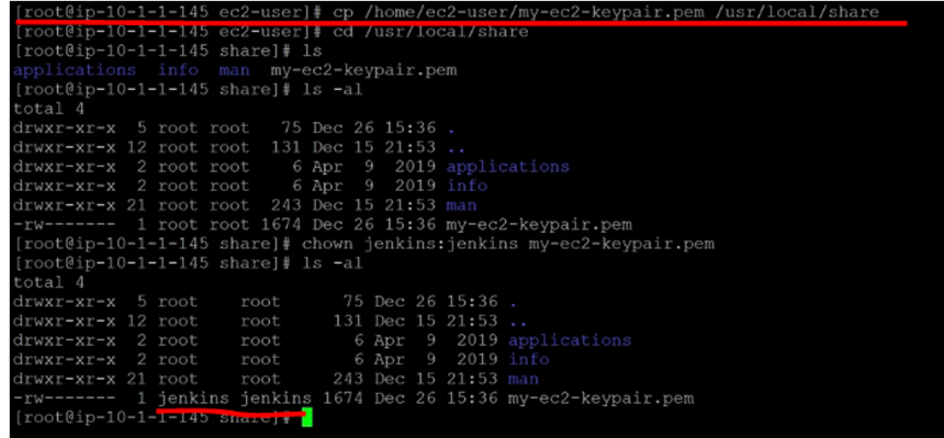 그리고 이제 이 pem key를 jenkins도 사용할 수 있도록 /usr/local/share로 cp 시키고, jenkins가 사용할 수 있게 ownership을 root → jenkins로 수정해주자