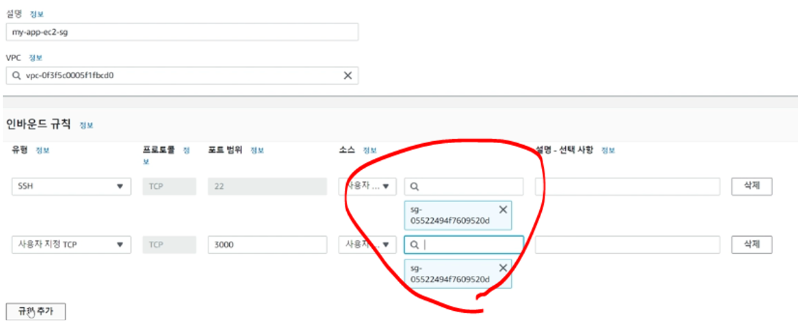 그리고 이런 인스턴스의 sg끼리 엮이게 할 경우에는(가령, openvpn으로 react의 ec2의 3000번 포트로 접속할때) 아래와 같이 인스턴스 id가 아니라 sg id를 가지고 source를 작성해준다는 점을 기억하자