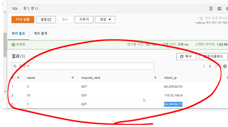 기존에 만들어뒀던 ALB의 속성에서 엑세스 로그 활성화를 누른 후 이 Access log가 저장될 S3 위치를 잡아준 후 이에 대한 쿼리를 진행할 Athena table(AWS 공홈에 있는 ELB Athena table 예제 활용)을 만들어준 후 쿼리를 마찬가지 방법으로 실행해서 내가 필요한 정보들만 아래와 같이 뽑아내면 된다