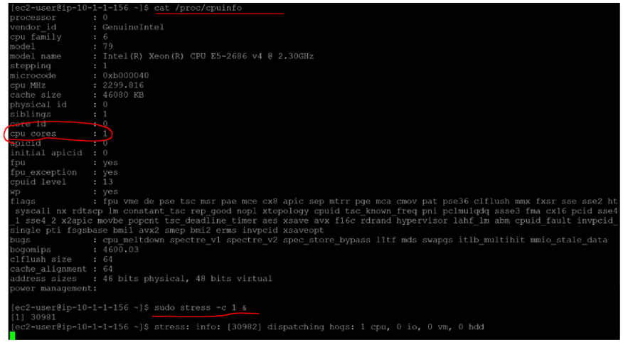 이후 SSH로 ppk key로 my-dragon-app-ec2에 접속해서 stress test를 해보자. 그러기 위해서 먼저 cat /proc/cpuinfo로 전체 cpu cores가 몇개인지 확인한다(아래의 경우에는 1이다). 이후 sudo stress -c 1 &으로 이 1개의 core에 background로 stress load를 줘보자.