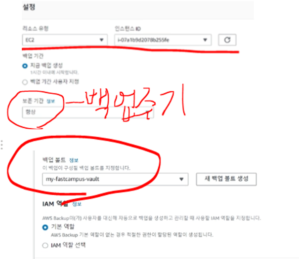일단 AWS Backup부터 하나 만들어주기 위해서 Backup Vault(my-fastcampus-vault)부터 만들어준 후 온디멘드 백업 생성을 아래와 같이 먼저 EC2(my-dragon-app-ec2)에 대한 Backup부터 진행시켜주자.