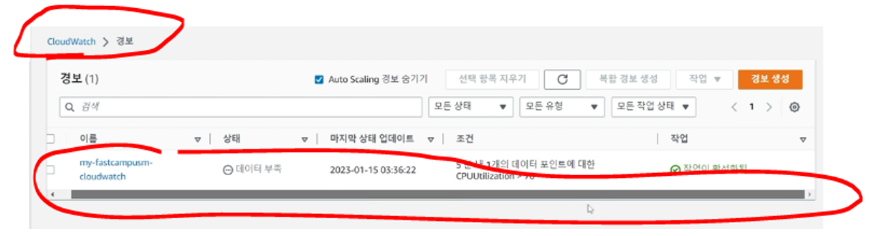 아래에 CloudWatch alarm이 설정되어 있는 것을 확인하자.