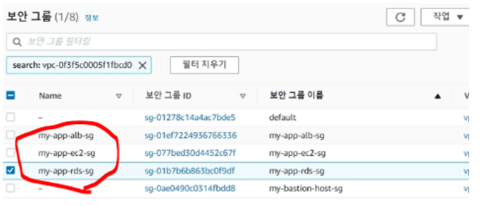 -rds의 sg는 MySQL 서비스 포트인 3306을 두개의 인스턴스 모두에게 열어주도록 하자
