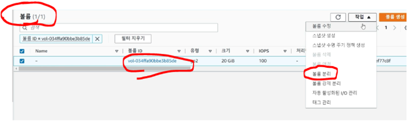 그러기 위해서는 일단 해당 EC2를 중지시킨 후 이 EBS 볼륨을 아래와 같이 분리시키면 된다.