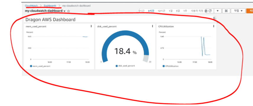 이제 CloudWatch dashboard를 생성해보자. 내가 원하는 Metric이 나오도록 생성하면 된다.