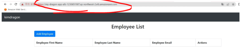 이후 내 local web browser로 (private ip 주소):80으로 하면 접속이 불가능한데 그 이유는 이 80 Port의 sg는 alb에서만 접속이 가능하도록 설정이 되어 있기 때문이다. 따라서 이때는 아래와 같이 이 ALB로 직접 접근을 해야하는 것이다.