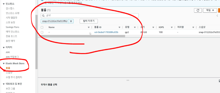 그 후 동일하게 이 Snapshot으로 복원을 하면 EBS 볼륨에 생성이 되게 된다
