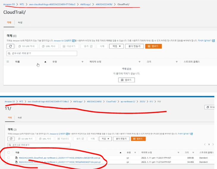 그리고 같이 생성된 S3 버킷에 들어가보면 해당 S3 버킷에 CloudTrail directory에 Audit Log가 남는 것을 볼 수 있게 된다