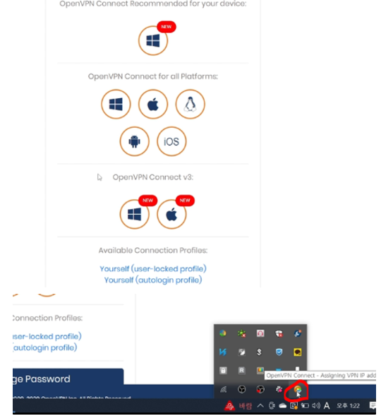 그리고 뿌띠로 ppk key로 openVPN용 EC2에 접속한 후 default 설정들을 진행해준 후 나오게되는 Admin URL을 가지고 내 local web browser로 admin user로 접속 후 해당 Web UI에서 내 private ec2로 접속하는 user를 만들어준 후 이 user로 다시 Web UI에 로그인을 해주면 아래와 같이 OpenVPN을 Connect하는 것을 다운로드 하라고 나온다.