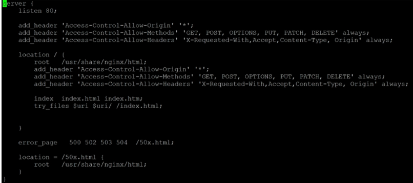 이후 이 프론트엔드 소스를 Nginx에 복사를 해주기 위해서 프론트엔드 소스코드 directory의 /conf에 있는 conf.d에 들어가서 default.conf를 확인해보면 아래와 같이 Nginx 설정이 들어가 있다.