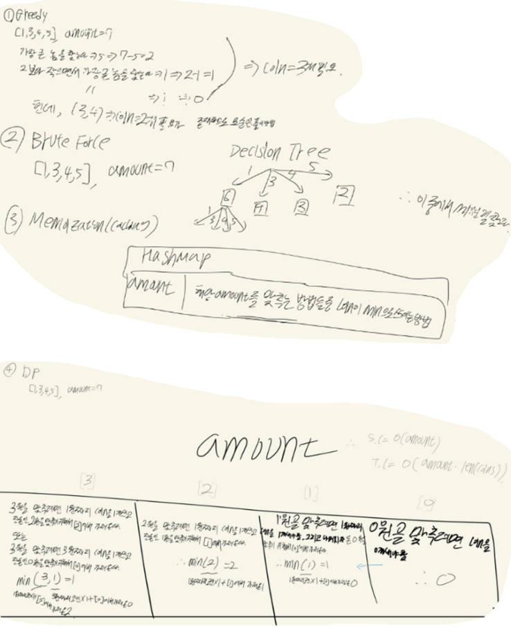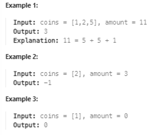 amount를 맞추려면 총 몇 개의 coin을 줘야하는지 그 minimum 값을 구하라. 만약 amount를 맞출 수 있는 방법이 없다면 -1을 return하라
