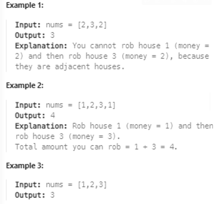 adjacent(바로 근접)에는 갈 수 없을 때 최대로 뽑아낼 수 있는 Output을 구하라. 단, 여기선 nums가 circle의 형태로 arrange 되어 있다