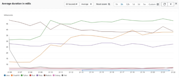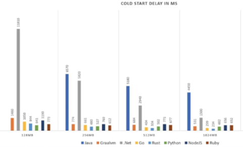 그리고 Warm State일때 평균적인 Duration을 나타낸 것으로 이 역시 Golang과 Rust가 짧은 것을 알 수 잇다.