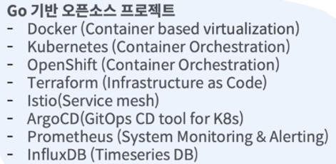 k8s가 Go로 만들어졌으므로 Cloud환경에서는 Go가 굉장히 많이 쓰이게 된다. 또한 Go를 알면 실제로 k8s 아키텍쳐가 어떻게 돌아가고 동작하는지를 Code Level로도 파악할 수 있다.
