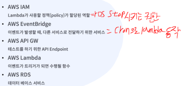 일단 이번에는 api gateway를 통해 lamba를 trigerring시켜서 rds를 멈추게 만든거 까지만 구현을 하고 이걸 나중에 알아서 EventBridge를 사용해서 cron 성격으로 변환해주도록 하자.