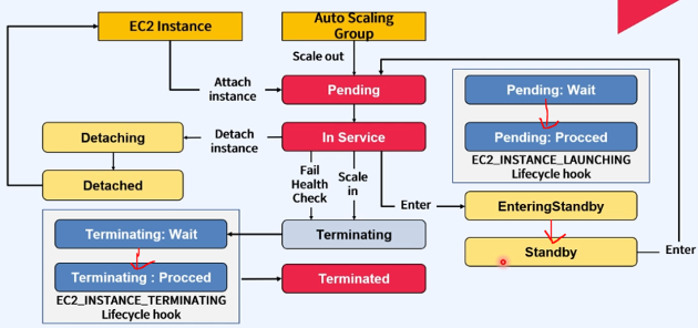 ASG가 Scale out되어 새로운 EC2 Instance를 붙이게 되면 Pending 상태가 되게 되는데 이 Pending 상태는 2가지(Pending: Wait와 Pending: Proceed)로 구분되어 Lifecycle hook을 지정할 수 있다. 그 후 이 EC2 Instance가 서비스를 진행할 수 있으면 In Service 상태가 되고, 이때 health check를 실패하거나 scale in이 되면 Terminating이 되고, 이때도 2가지 상태가 존재한다. 이후 EC2 Instance가 완전히 제거되면 Terminated 상태가 된다.